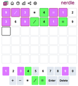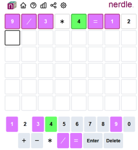 4) My customary initial guess is 9/3*4=12. That gives a reasonable amount of information as it tests a string of digits (1,2,3,4) and two operators. That is not the optimal first guess, based upon some calculations done by a friend. But it is satisfactory for my enjoyment. There are undoubtedly other web resources which assist with analysis of Nerdle puzzles.